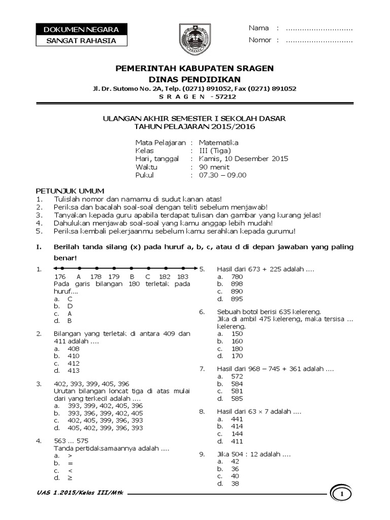 Soal Ukk Matematika Kelas 3 Beserta Jawaban 2017 2021