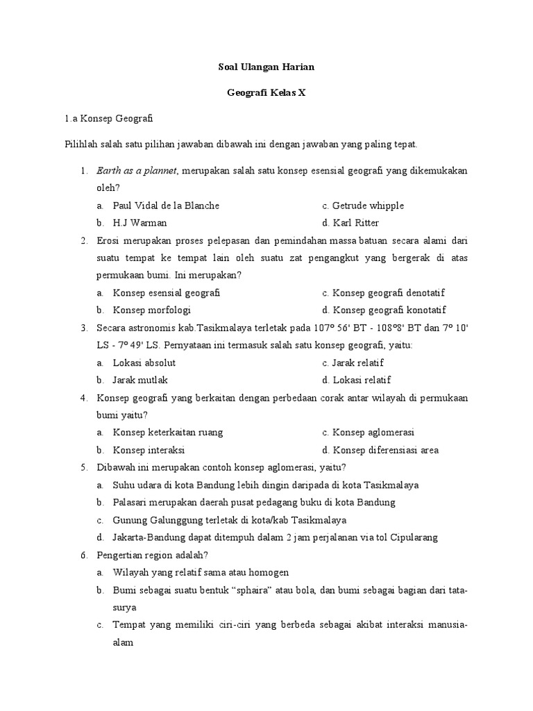 20200902 Contoh soal konsep geografi dapat kita temukan di soal ujian nasional sma ma tahun 2012 pelajaran geografi soal nomor 2. Soal geografi tentang konsep wilayah dan tata ruang. 10 Istilah geografi merupakan gabungan dari 2 kata dari bahasa Yunani yaitu.